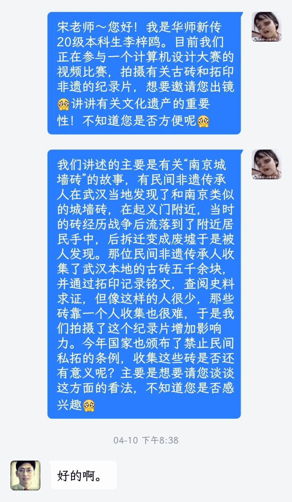 团队成员邀请非遗传承人张亮老师参与拍摄的相关聊天记录
