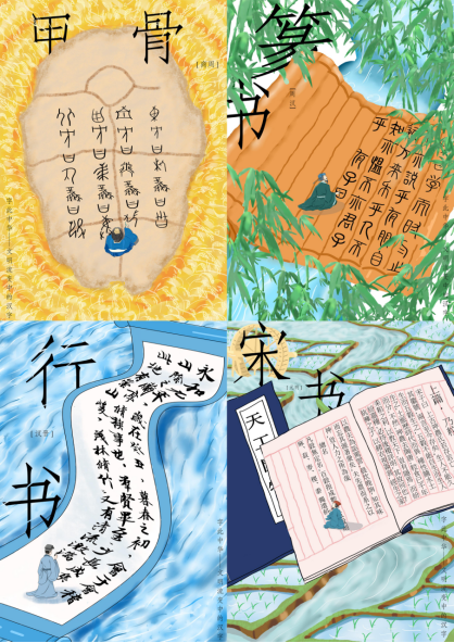 从单个乐动体育在线登录官网来看,以汉字书写材料变更为主体,选取相应时代盛行的字体、文化内容、精神象征元素等进行有机组合,以期呈现不同时期的文化风貌。汉字放大、人物缩小,意在表明文化成果之宏大以及人之渺小,但正是有千千万万的人才创造出了意蕴深远的文化。而从整体上看,意在表现正是有了文字的记载,文明的发展的宝贵结晶得以留存至今;而文明的滋养,造就了丰富灿烂的汉字文化。