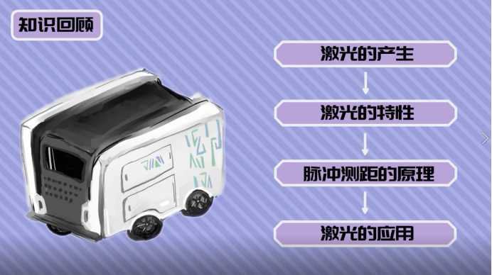 随着技术的发展,在疫情倡导零接触的情境下,无人快递车进入大学校园。无人车上坡下坡均能平稳行驶,遇见障碍物还会自动停下,这与高中物理选修 3-4 中的激光相关知识有很大关联。我们在微课中通过生动有趣的动画形式讲解有关激光的知识;运用多场景、多人物对话等形式增加微课的趣味性、吸引力;同时将内容聚焦于疫情下的新兴科技,具有时代性、应用性。