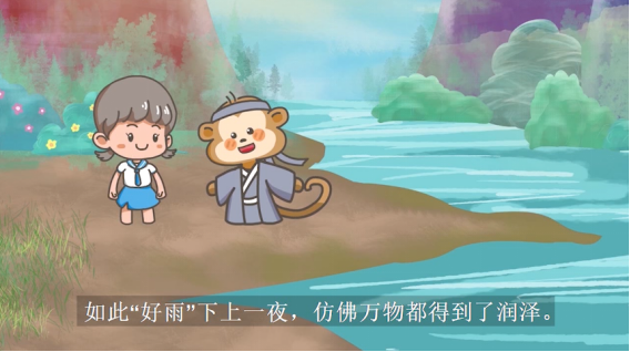 《当古诗词遇上科学》围绕“春天”为主题,选取《惠崇春江晚景》、《春夜喜雨》、《赋得古原草送别》三首小学必备古诗作为创作内容,以呼吁学生积极观察、亲近自然。首先,本微课设计了“古诗王国小精灵”和“小女孩墨儿”的动画IP形象,以“墨儿误入古诗王国”的故事情节导入,以双向化的对话替代单向化的讲解,打破传统教学模式;其次,通过Adobe Premiere、Animate、Focusky等工具创设情境,让小学生身临其境地体会古诗中描绘的的场景;再者,在跨学科融合的理念之下,融入生动有趣的自然科学知识,激发学生学习兴趣的同时帮助其理解古诗;最后,增设“写景文”写作教学模块,剖析古诗中运用的写景方法,通过诗文教学一体化的方式培养小学生学以致用的能力。