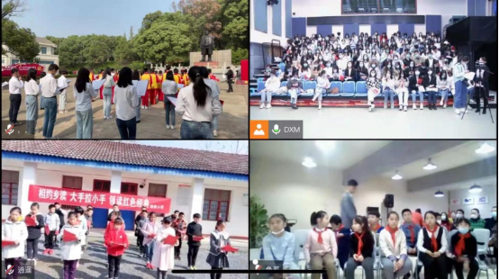 “这就是我们可爱的中国、可爱的中国!”在华师分会场,辛静老师和李鸿老师带领一百多位学生包括学生党员、入党积极分子,同步朗诵《可爱的中国》;在视频直播的另一端,来自湖北随县洪山镇鲍集小学的同学,也用稚嫩的声音共同朗诵《可爱的中国》;四所学校同学们的朗朗诵读声回荡在神州大地。