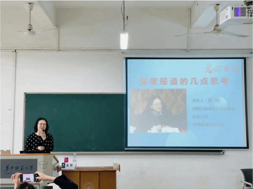 夏静认为,深度报道是有力量的。她用《“保护学生是我的天职”——记湖北省潜江市浩口镇第三小学教师秦开美》一文,向学生讲述了新闻媒体如何进行新闻预警以及引导社会舆论。