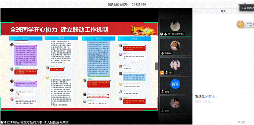 第四位进行述职的是17级研究生新闻学党支部书记曾琦。该支部注重用生动的视频资料来支撑特色的党支部活动,在疫情期间也在认真发挥作用,采用邮寄等方式进行线下填写。与此同时,还存在着开展活动的严肃性不足、领会会议精神不足、党员之间的联系不足、批评和自我批评的民主生活会的效果不足等问题,会在之后的建设过程中进行改善。