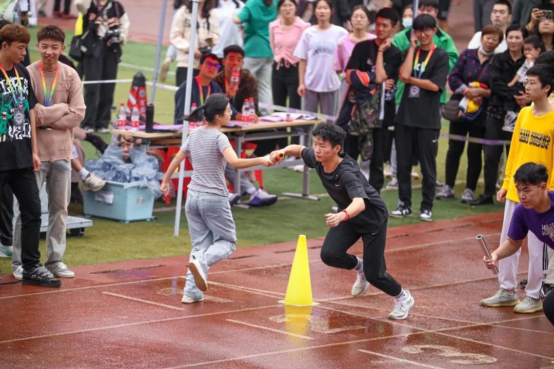我院选手在第四组上场。比赛开始时,新传学子尽力擂鼓,全院学生为我们的选手奋力呐喊。比赛中,运动员们都精神饱满,奋力奔跑。虽然过程中有掉棒失误,但运动员并未犹豫,立即拾起接力棒向前奔跑;后面的同学也没有因为一时的落后而怠慢比赛,竭力追赶,最终取得较为满意的成绩。对于失误,2022级本科生邹宇轩表示:“这不会影响我们的士气。我们享受了比赛、展现了集体力量,已经没有遗憾了。”