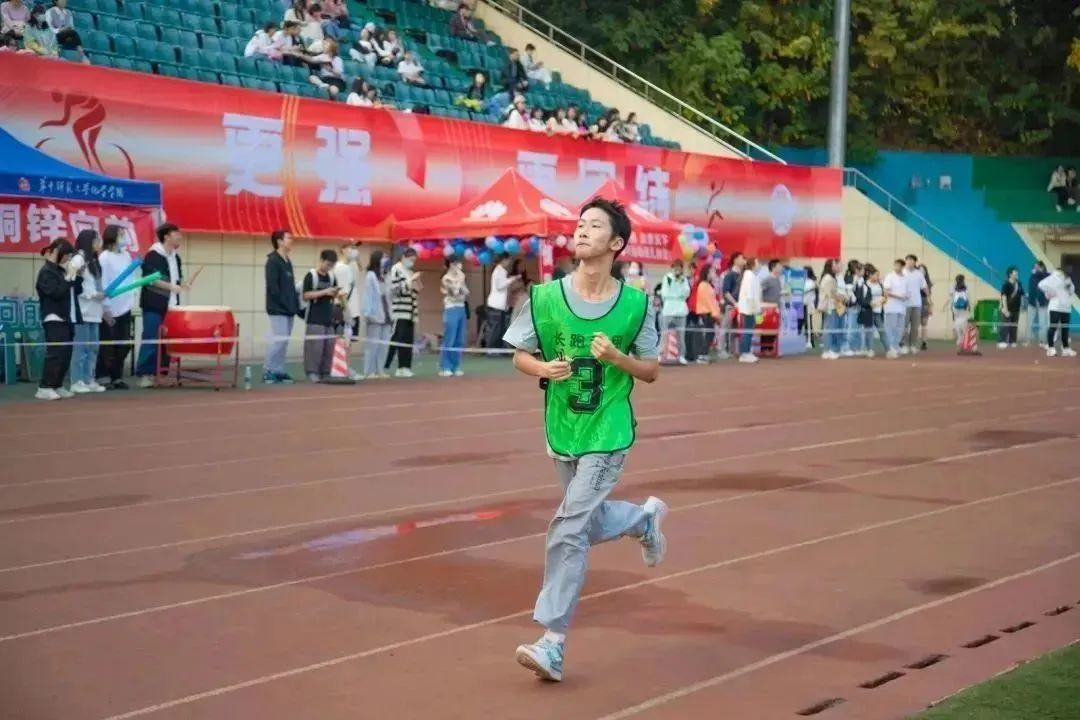 一声枪响,选手们纷纷冲出起跑线。最初,杨思辑按照自己的节奏奔跑着,并在最后100米时开始持续加速,直至冲过终点线。而在本次比赛中,和杨思辑一起奔跑的还有我院2022级未参赛的男生们,他们轮流高举院旗,为我院参赛选手加油助威。赛后,杨思辑回忆道:“听见场外老师和同学的加油声时,我就感觉有力气坚持下去了。”