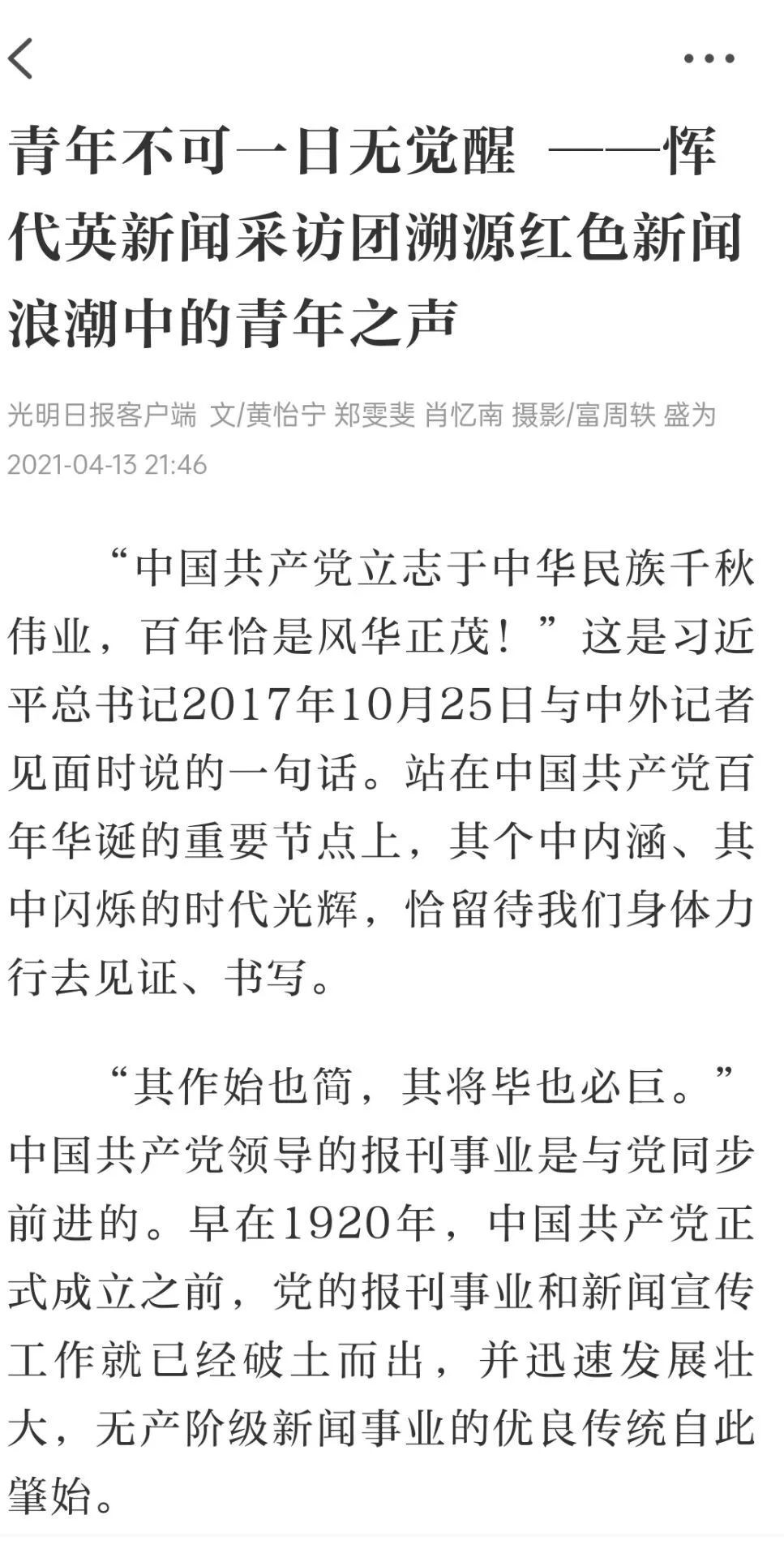 2021年3月,郑雯斐随采访团一行前往上海和嘉兴,重走党的初心路,溯源红色新闻史。从老渔阳里2号走到新渔阳里6号,再自望志路106号走向嘉兴南湖,采访团所行之处无不诉说着百年来的沧桑巨变。驻足于此,郑雯斐亦感受到了百年前革命报人们的赤子情怀与办报热忱。实践结束后,郑雯斐撰写的新闻稿《青年不可一日无觉醒》发表于光明日报,活动侧记获华中师大报整版报道。