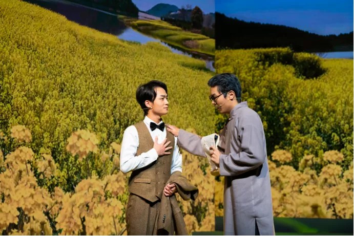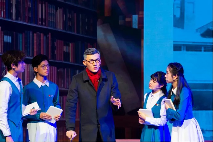 四周黑暗,只有黄乔站在唯一的光里。站在舞台上的那一刻,扮演陈时校长的他褪去了自己的印记,眼中只有先辈一生追求的办学事业。