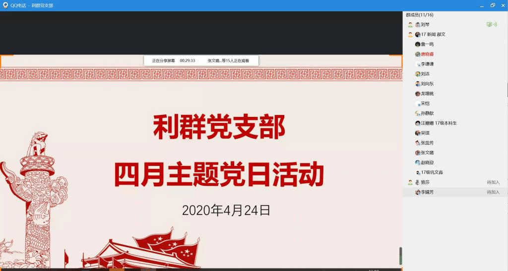 华新在线讯(记者 李谦谦)4月24日,利群党支部四月主题党日活动如期召开。虽然受疫情影响,此次当日活动只能在线上展开,但在支部书记刘琴的带领下,同学们依然积极踊跃地参与主题讨论。