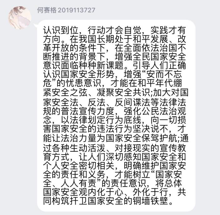同学们积极参与了这次的班会讨论,对于国家安全同学们表示,通过学习,进一步了解了我国总体国家安全体系,也了解了新形势下的国家安全风险,不同的同学从不同的方面表达了自己所体会到的当前状况下的国家安全问题,也表达了自己对于祖国的感恩与期许,也愿意付出行动为祖国的安全建设出力。