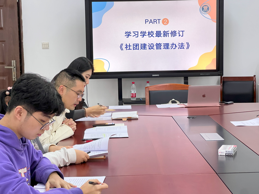 汇报完毕后,黄怡宁组织学习了我校新印发的《华中师范大学学生社团建设管理办法》,并结合学生社团具体情况,在社团管理、社团活动、宣传工作三个方面的相关事项作出要求,进一步明确了学生社团的工作规范。