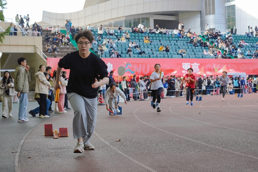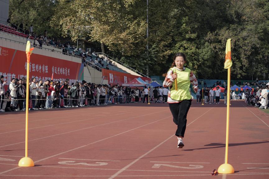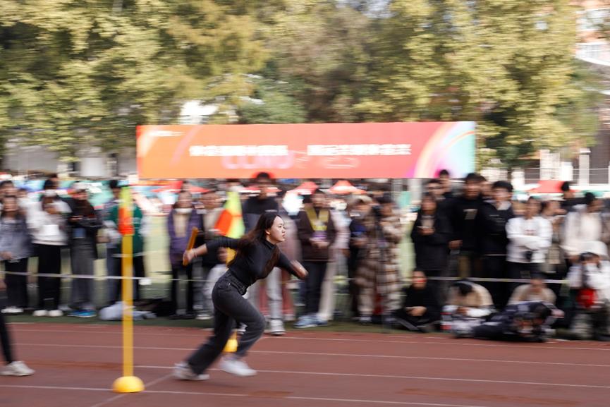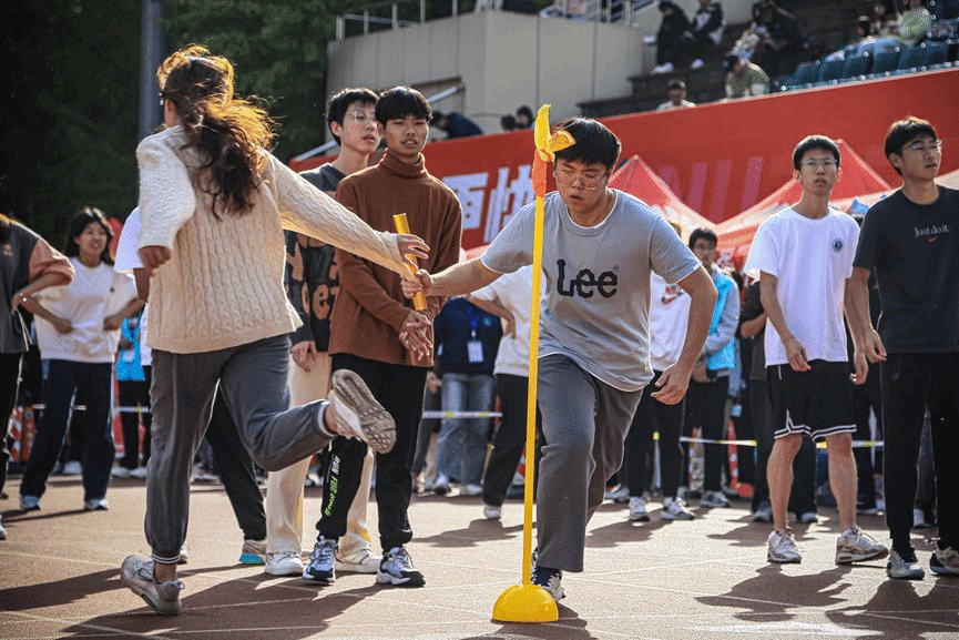“新传……加油!”跑道两旁的欢呼声不绝于耳,不远处铿锵有力的鼓点点燃了现场的气氛。在接到接力棒的一刻,选手们宛若被拧上发条,顾不上表情管理,只管拔腿向前跑。