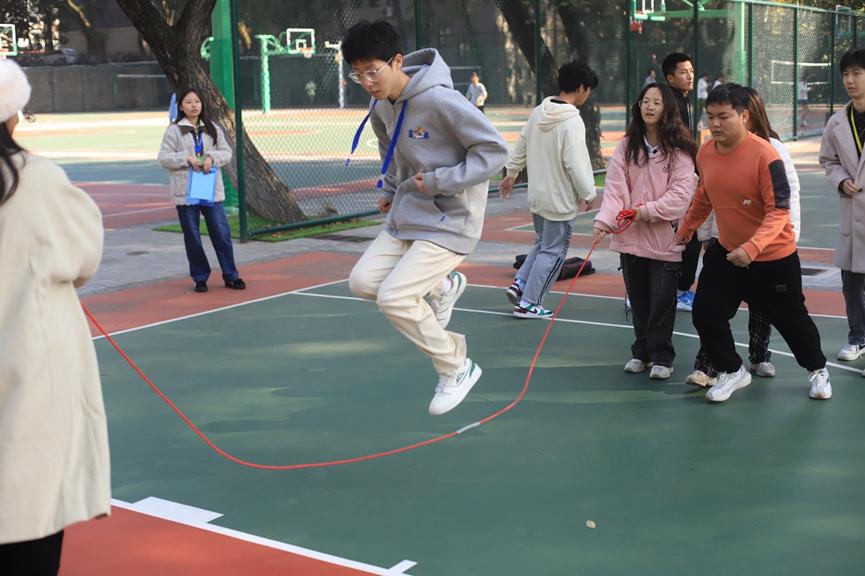 比赛正式开始,摇绳的同学先以较慢的速度摇绳。第一个跳的同学对控制节奏起到关键作用,只见她找准时机,迅速进入并跳过绳子,又一个飞跃,下一个同学接着跳了进来,后面的同学也一个接一个地顺利完成。在接下来的几轮中,摇绳的同学加快了速度,队员们的状态越来越好,灵活地在上下甩动的绳子中穿梭。中途虽然有一次失误,但是他们迅速调整,重新找回了状态。最终我院参赛队伍取得了共计125个的好成绩。