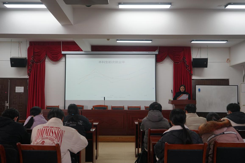 随后,刘老师结合数据介绍了目前学院各专业的升学、就业情况。这一内容涉及到大家未来的长远发展,同学们反响热烈,纷纷对毕业生去向的统计数据、图表拍照记录。刘老师最后强调,选课和专业固然重要,但并不能决定一切,在以后的升学和工作中,除了本专业的知识技能外,我们还需要掌握多种知识技能,全面发展,所以提升个人的综合素养和能力才是我们在大学生涯中学习的最终目标。