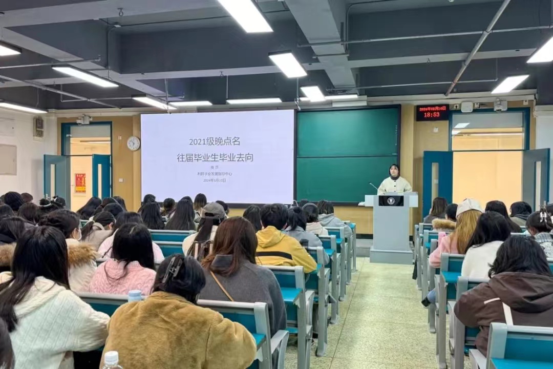 3月10日晚,我院2021级本科生晚点名暨往届毕业生毕业去向分享会于8311教室召开,2021级全体本科生参会,辅导员骆莎主持本次会议。