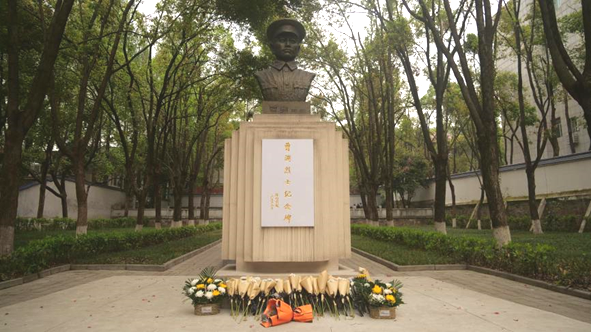 接着,在师生一同瞻仰曹渊烈士半身铜像。铜像上,曹渊同志面容刚毅,炯炯的目光直视前方。郭佳宜同学作为团员代表,讲述了曹渊同志的生平,她细数曹渊同志的贫苦出生,讲到他从被黄埔军校录取、到加入共产党,再到在攻打武昌城中英勇牺牲的短短一生,郭佳宜同学表示,曹渊同志的光辉事迹与革命精神被武昌人民口口相传,如今也被更多青年学子知晓,他为后辈树立起了永久的精神丰碑。