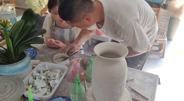 陶艺体验馆的客流量和经营情况呈现出积极的态势。平时店里会有3~4位顾客,到了周末则更加忙碌。返乡创业的年轻人们,不仅为游客提供了一个体验陶艺文化的场所,也为郝堂村的新业态发展注入了新的活力。