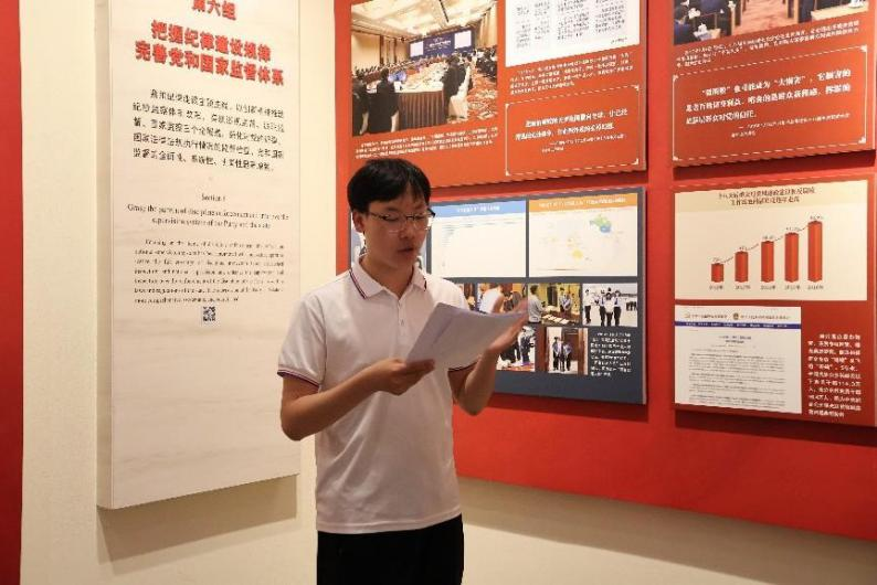 两校支部成员首先参观了中国共产党纪律建设历史陈列馆。参观过程中,来自华中师范大学的党员贾聪聪同志和谢姿璇同志为全体党员讲解了中国共产党自成立以来至十八大以前的纪律建设成就。来自华中科技大学的党员王梓晗同志带领全体党员回顾了十八大以来的党纪建设历程。