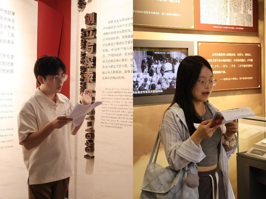 参观完中国共产党纪律建设历史陈列馆后,在乐动体育在线登录官网研究生第一党支部副书记邹智鹏同志的带领下,两支部全体党员共同重温了入党誓词。