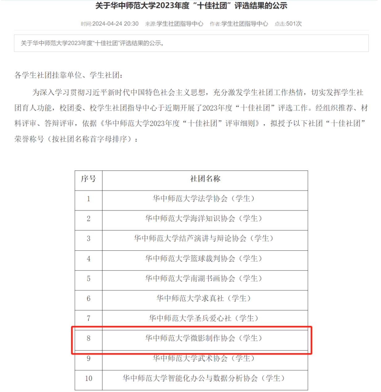 近日我院微影制作协会荣膺校团委、校学生社团指导中心授予的校园“十佳社团”称号,这一荣誉充分彰显了该协会在微电影创作领域的显著成果和在校园文化创建工作中做出的重要贡献。