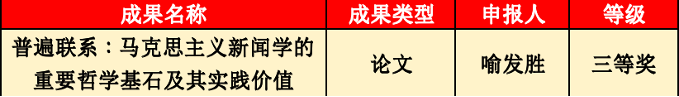 华新在线讯(通讯员 孙艺)近日,教育部正式公布第九届高等学校科学研究优秀成果奖(人文社会科学)评选结果,我校共24项成果获奖,我院喻发胜教授的研究成果《普遍联系:马克思主义新闻学的重要哲学基石及其实践价值》荣获三等奖。