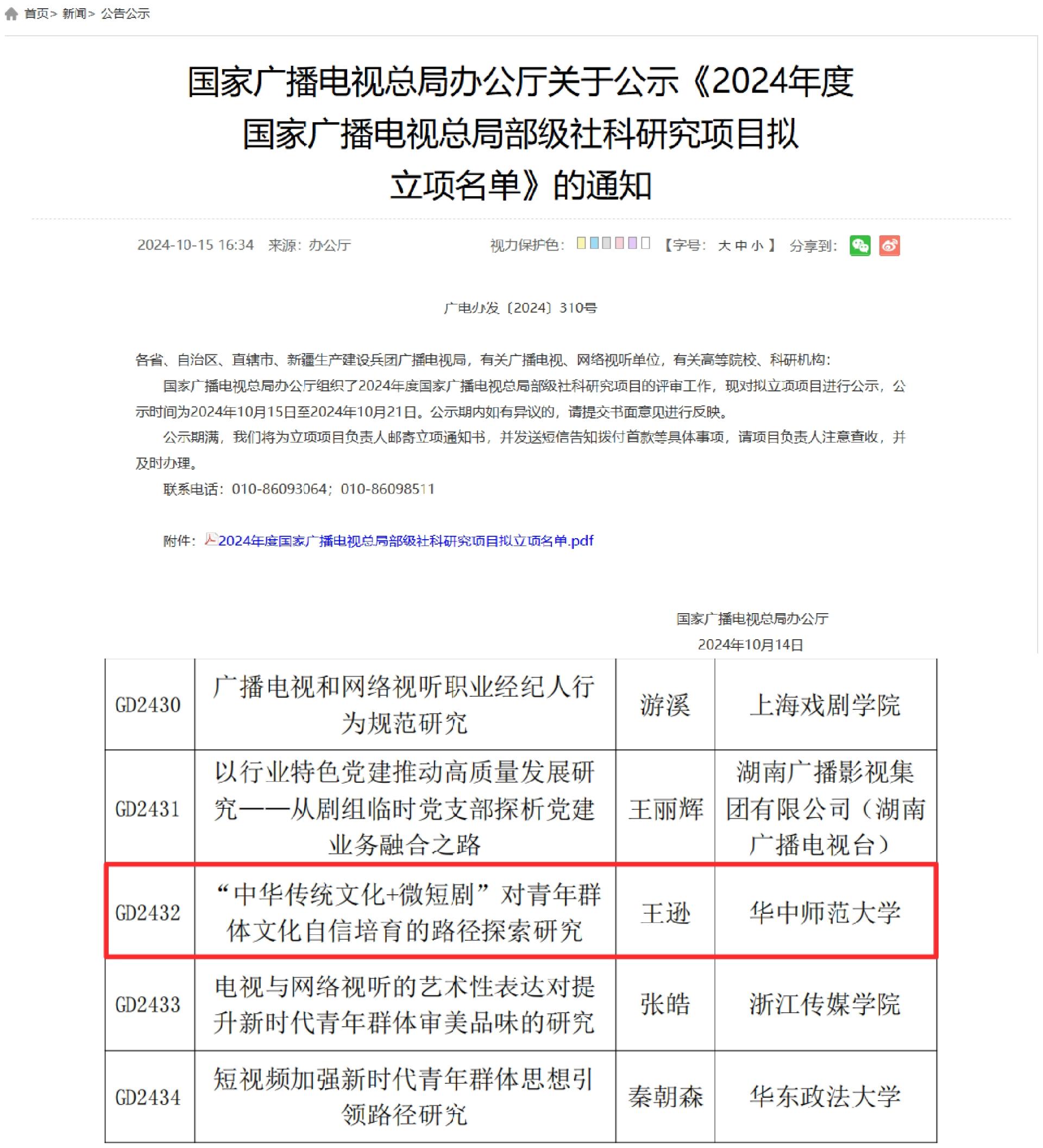 10月15日,国家广播电视总局办公厅完成2024年度国家广播电视总局部级社科研究项目的评审工作,并对拟立项项目进行了公示。我院副教授王逊申报的《“中华传统文化+微短剧”对青年群体文化自信培育的路径探索研究》成功获批2024年度国家广播电视总局部级社科研究项目立项,实现我院国家广电总局社科研究项目上的再次突破。