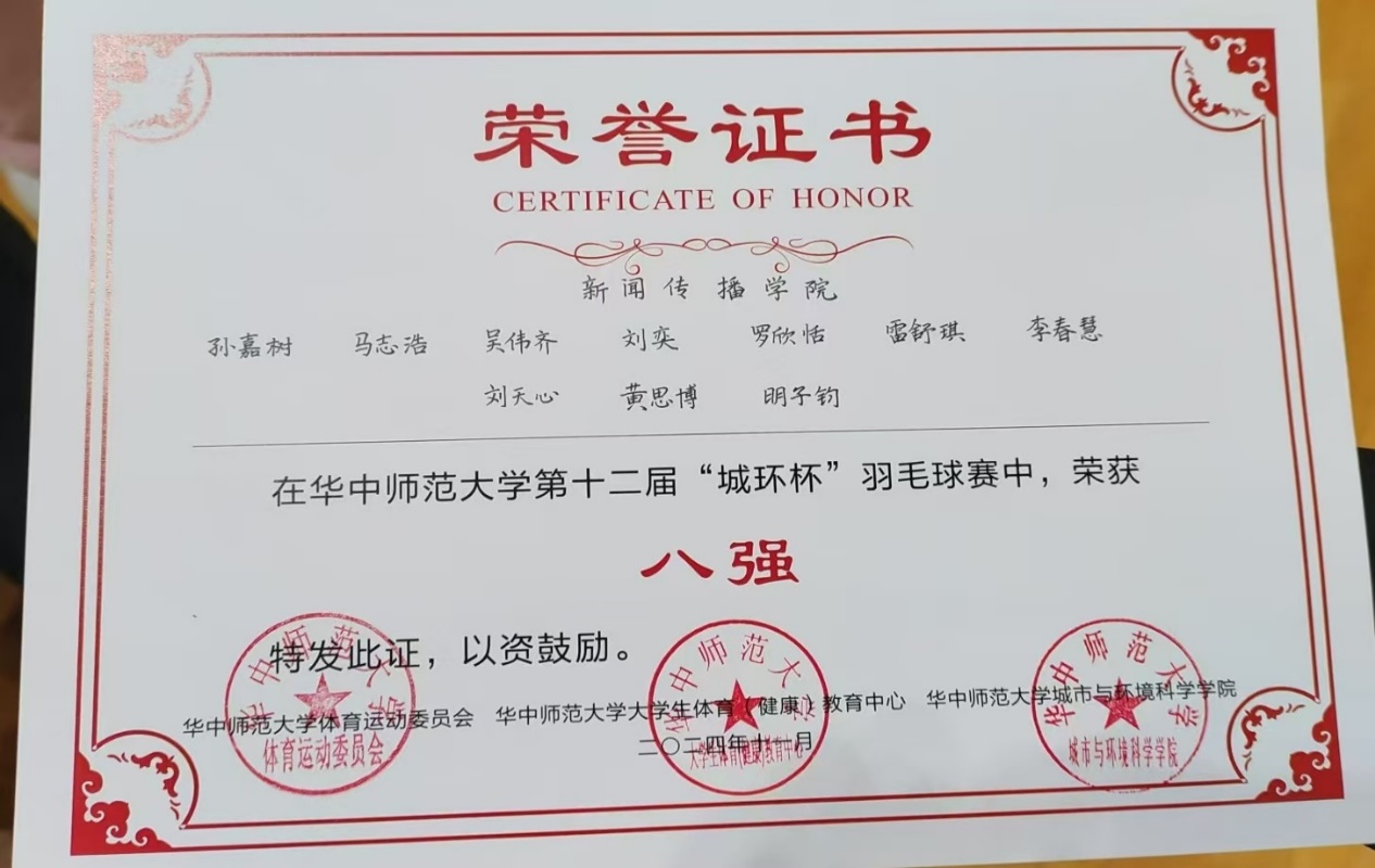 11月24日比赛结束后,新传羽毛球队以前八强成绩站上领奖台,不仅展现了羽毛球队的光荣再现,也增强了新闻传播学院的凝聚力和向心力,展现了学院积极向上的精神风貌。羽毛球队成员表示,希望接下来能大家都能继续磨练球技,再创佳绩!