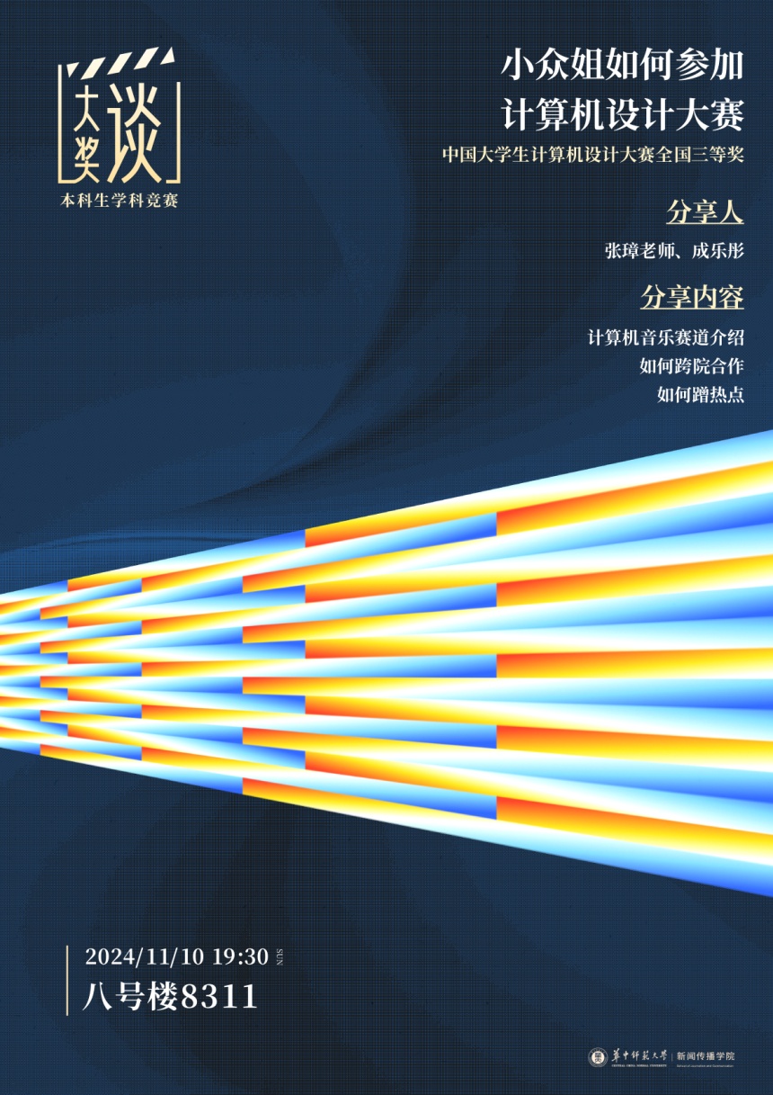11月10日,张璋老师与成乐彤以“小众赛道如何参赛:计算机设计大赛经验分享”为主题,讲述了他们的参赛历程,其原创MV《唱游珠算》在全国大学生计算机设计大赛中斩获三等奖。计算机音乐赛道具有独特性,与数字动漫与短片、数媒静态设计等存在差异。