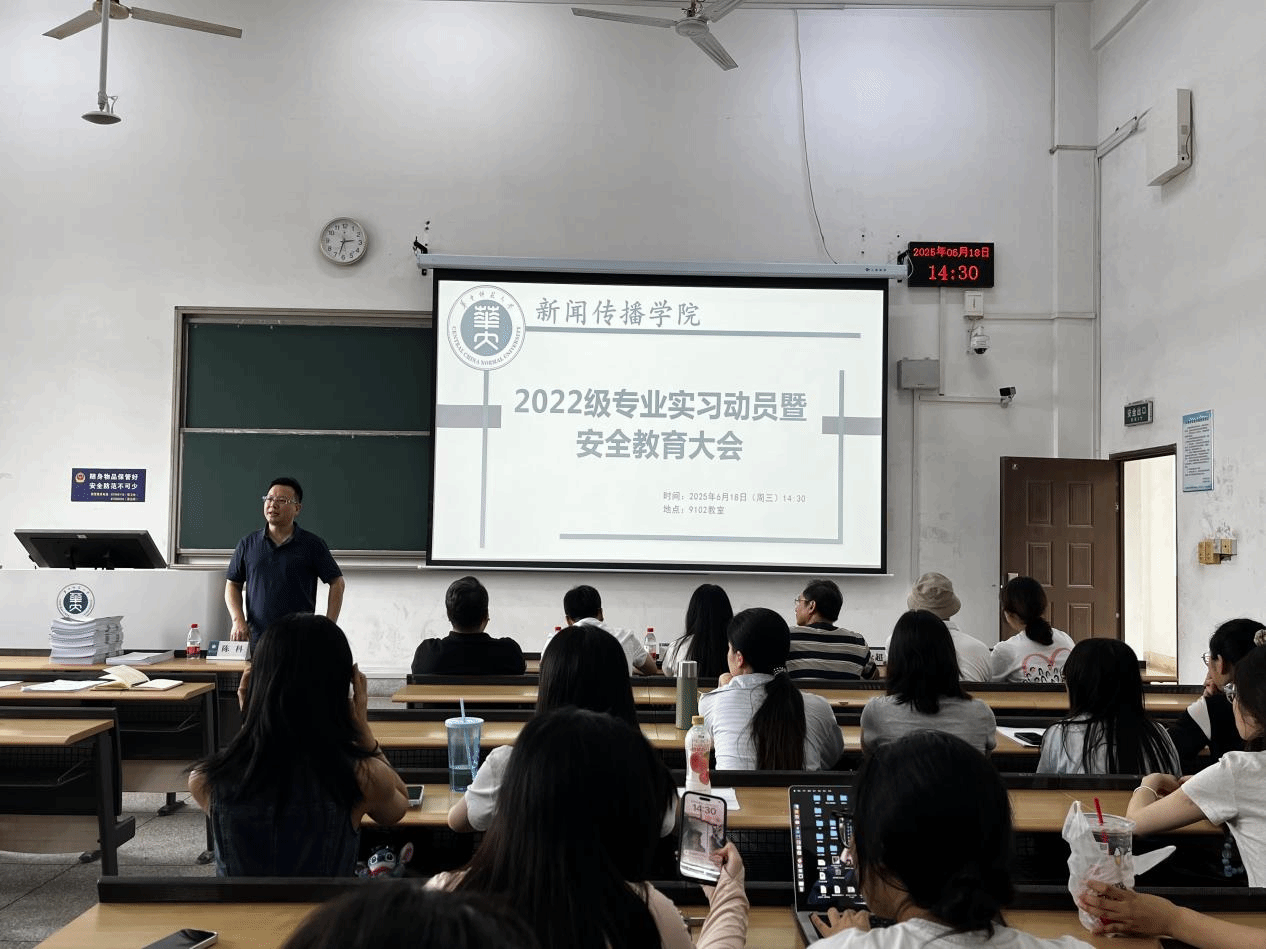 为保障我院专业实习的顺利开展,强化实习管理,明确实习内容,确保实习质量,6月18日下午,新闻传播学院在九号教学楼9102教室召开2022级专业实习动员暨安全教育大会。本次会议由教学副院长陈科主持,院长万忆、院党委书记夏守信、党委副书记程秀莉,张勇军、许永超、白嗣新老师,辅导员李鸿以及教学秘书吴迪出席本次会议。全体2022级实习生齐聚一堂,共启专业实践新征程。