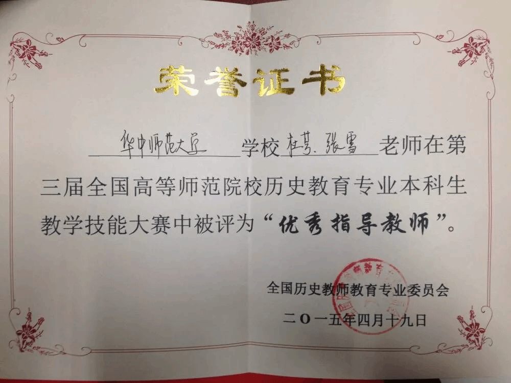 杜芳、张雪荣获第三届全国高等师范院校教学技能大赛优秀指导教师奖