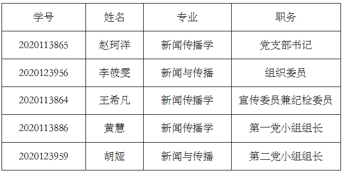 根据《关于开展新闻传播学院2020级研究生党支部、团支部干部选举活动的通知》,经学生自主申请、党员投票选举、班级民主投票选举等环节,现将我院2020级研究生党支部、团支部干部选举结果公示如下。