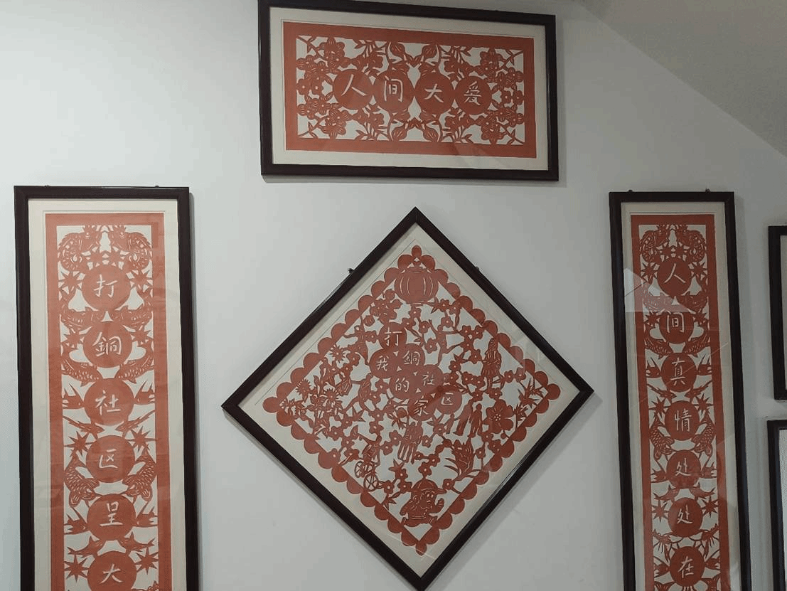 不仅如此,在工作站的现场还能看到居民制作的文化产品,如手串的珍珠饰品、剪纸艺术品、勾丝花等等。打铜社区还成立了自己的“直播间”,背景板、灯光、支架等设备一应俱全,视频内容涉及辖区商户的推广、假期托管班师生互动等等。