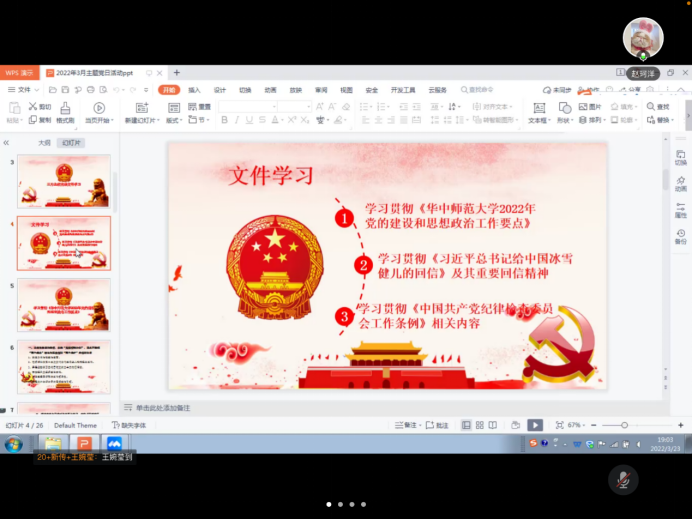 本次学习主题为:全国两会精神、《华中师范大学2022年党的建设和思想政治工作要点》、《习近平总书记给中国冰雪健儿的回信》和《中国共产党纪律检查委员会工作条例》的思想内容。