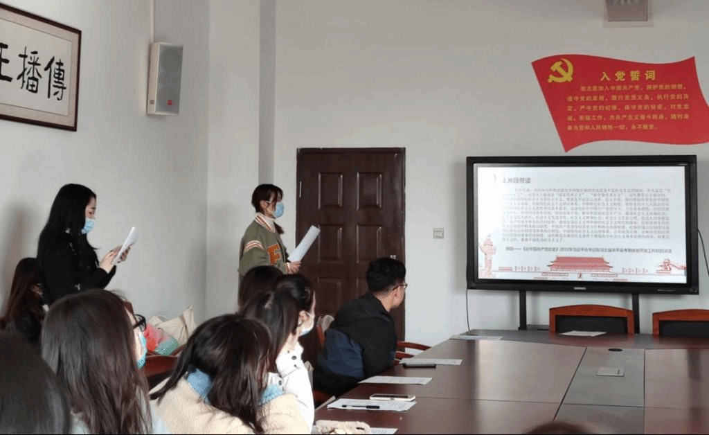 第二部分是由王悦等4位同学带读经典片段并就“中国特色社会主义”、“中国梦”“新时代青年将堪当大任”、“牢记初心和使命”四个话题做交流分享。