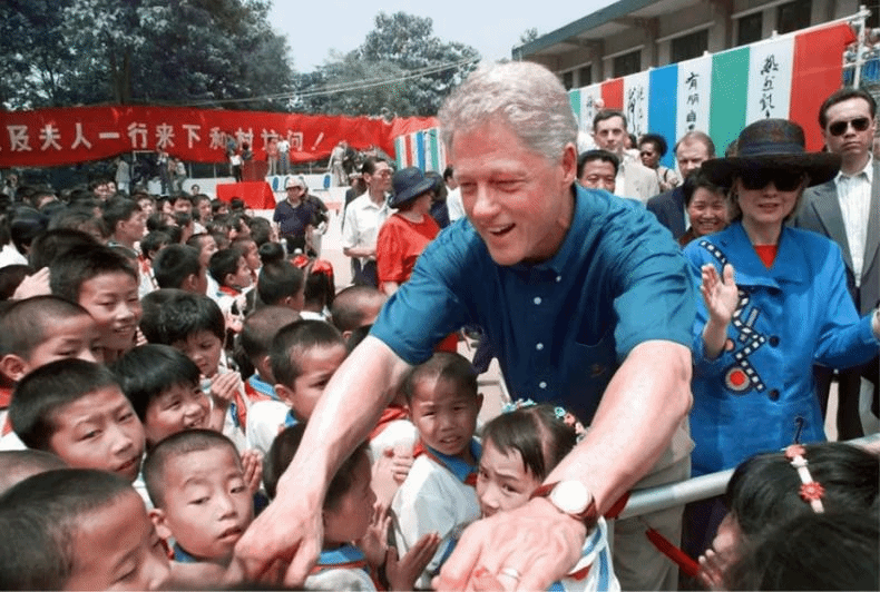 1998年6月26日,克林顿夫妇在西安市郊的下和村与学生们打招呼