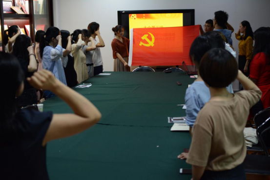 华新在线讯 (通讯员 朱玲莉 安蓝玉)“我志愿加入中国共产党,拥护党的纲领,遵守党的章程,履行党员义务,执行党的决议……”6月30日下午,为纪念中国共产党成立96周年,新闻传播学院21名新发展入党的学生在院会议室内面对鲜艳的党旗庄严宣誓,并举行了以“学党史 感党恩 跟党走”的支部主题党日活动,院党委书记韩君华、党委副书记夏守信出席了本次支部主题党日活动。