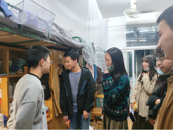 在走访宿舍过程中,辅导员与大家们亲切交谈,旨在了解学生思想动态、学习生活、宿舍情况,给同学们送去初冬中热切的关怀,由于我院专硕男生均为单独住在混寝,大家表示感情却十分要好,可以互相串寝,查寝过程中,气氛十分活跃。