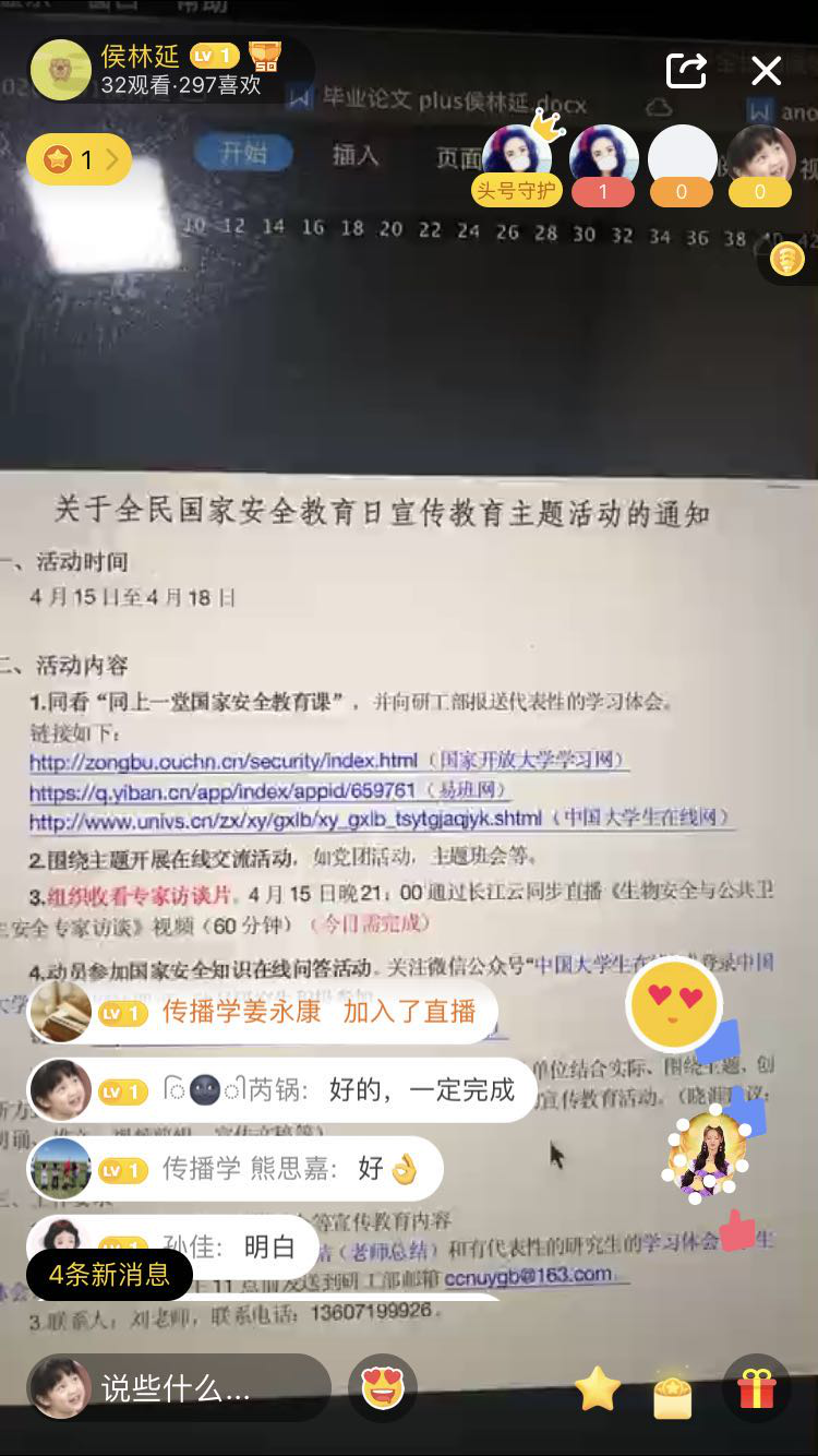 (通讯员蒋芮)4月15日,是国家安全教育日。为响应学校和学院的号召,2017级传播学研究生班级展开了国家安全宣传教育主题活动。因为受到疫情的影响,这次特殊的班会活动在线上举行。