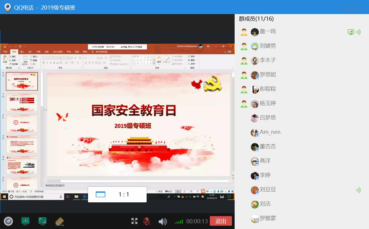 4月16日下午5点40分,开展了以“国家安全教育日”为主题的班会。由于当下疫情形势,本次班会以“线上”的形式开展。