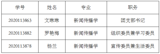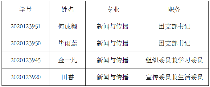 根据《关于开展新闻传播学院2020级研究生党支部、团支部干部选举活动的通知》,经学生自主申请、党员投票选举、班级民主投票选举等环节,现将我院2020级研究生党支部、团支部干部选举结果公示如下。